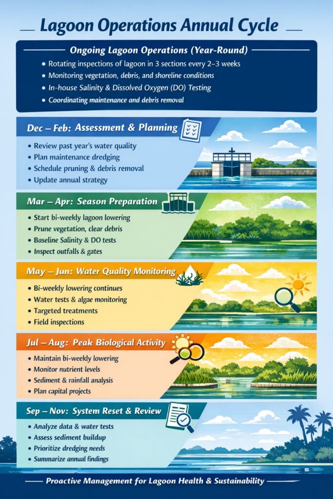 The Lagoon Operations Annual Cycle organizes our work into a consistent, year-round approach to monitoring, maintenance, and planning. This structure allows us to stay proactive, identify issues earlier, and align day-to-day operations with long-term goals.