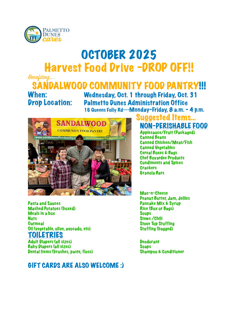 This month PD Cares is hosting a food drive benefitting Sandalwood Community Food Pantry! Donations can be dropped off all month at the Palmetto Dunes Administration Building. Please see details and suggested items below: